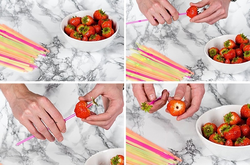 12. Вот как можно избавиться от хвостиков на клубнике с помощью коктейльной трубочки.