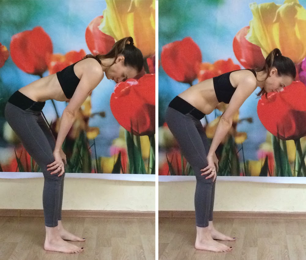 Когда вы научились правильно делать «вакуум» в положении стоя, то можно немного усложнить: наклоняем корпус вперед на 45 градусов, колени так же остаются слегка согнутыми, руки опускаем, но не опираемся на ноги. И делаем «вакуум».