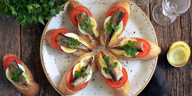 Бутерброды со шпротами, помидором, яйцом и лимоном