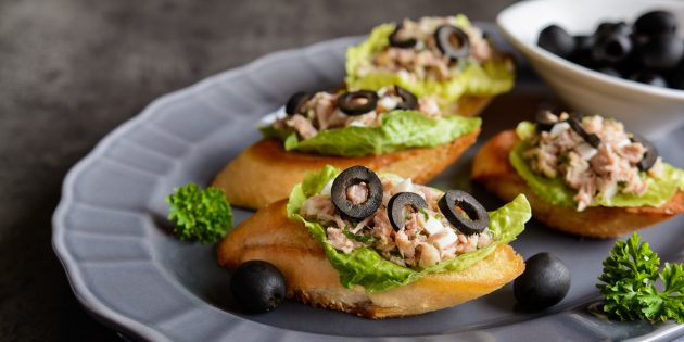 Бутерброды с тунцом, яйцами, сыром и маслинами