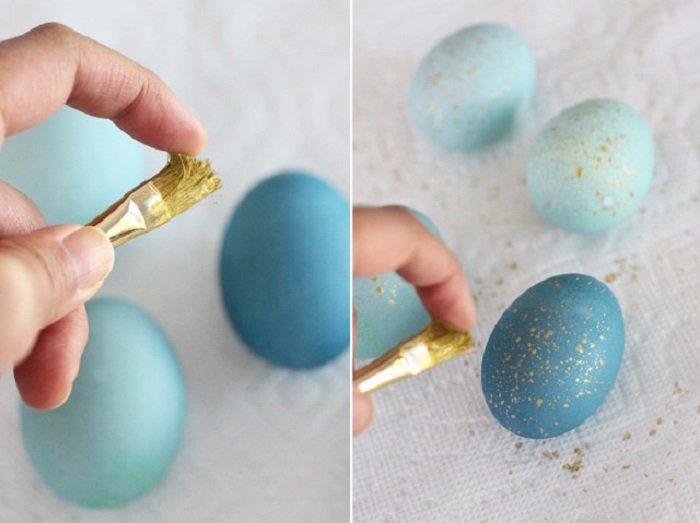 Для полного покрытия яйца используй сухой краситель и губку. Если хочешь совсем чего-то необычного, то есть другой способ нанесения. Раствори кандурин в воде, возьми кисточку и разбрызгай краситель по поверхности уже окрашенного яйца. Получится маленький космос.