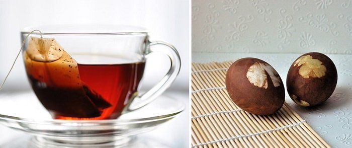 Чтобы получить на белых яйцах серо-голубой оттенок, понадобится заварить чай каркаде. Яйцо надо опустить на 3 минуты в заварку, а потом высушить. Процедуру следует повторить несколько раз, пока не получится насыщенный цвет.