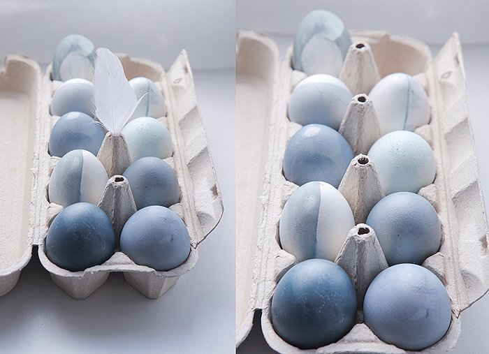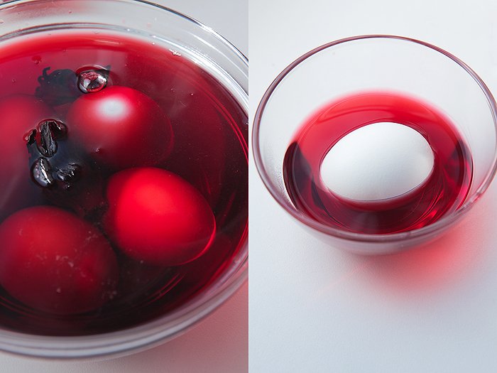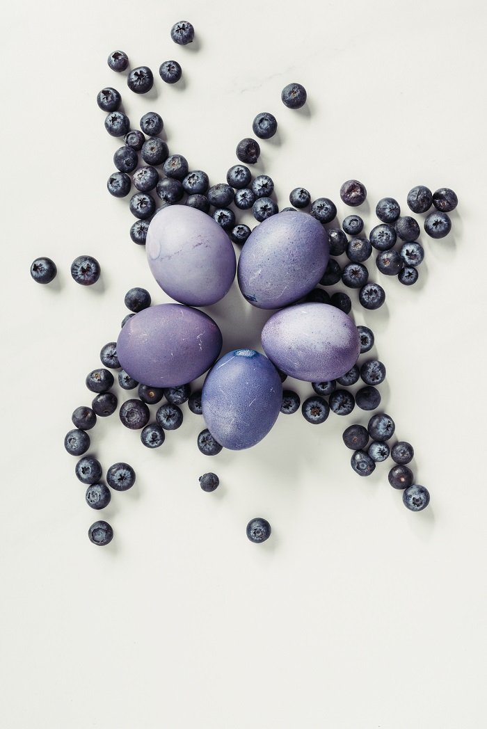 Красивый синий цвет получится из свежевыжатого черничного сока. Чем дольше в нём пролежат яйца, тем насыщеннее оттенок получится.