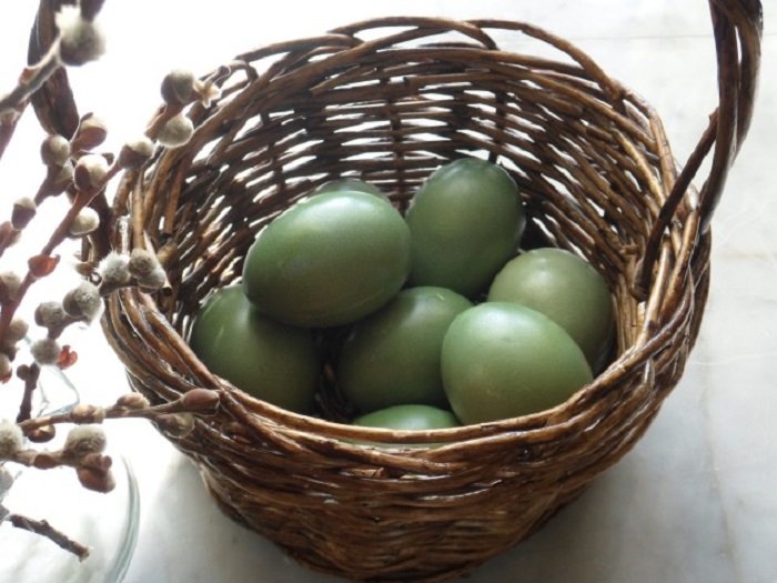 С помощью отвара из крапивы или шпината можно придать белым яйцам зеленый оттенок.