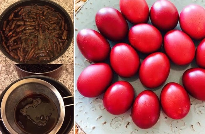 Корни марены красильной можно приобрести в аптеке. С ними надо немного повозиться, но зато получишь красивые яйца красного цвета.