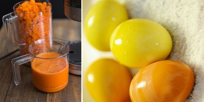 Еще один способ получить красивый оранжевый цвет. Для этого нужно натереть морковь на самой мелкой терке, чтобы можно было выжать сок из этой массы. Паприку залей кипятком и дай настояться. После процеди полученную смесь и смешай с морковным соком. Осталось добавить уксус, и краситель готов. Можно окунать яйца. Не забывай: чем дольше они пролежат, тем лучше покрасятся.