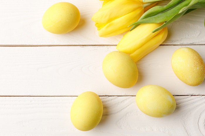 Подойдет для покраски белых яиц в желтый цвет. В кастрюлю наливаем воду, добавляем соль, уксус и куркуму. Доводим отвар до кипения и кладем в него яйца на 10 минут.