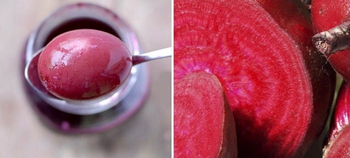 Сок свеклы придаст яйцам розовый оттенок. Для этого нужно либо замочить их на несколько часов, либо прокипятить вместе с соком и дать настояться.