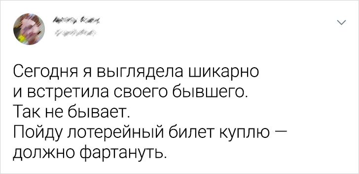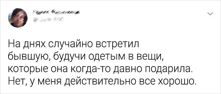 • Сейчас случайно встретила бывшего в трамвае. У нас завязался разговор. Он сказал: «А ты похорошела. Новый парень так повлиял?» Я: «Нет, просто наше расставание пошло мне на пользу». © AssbuttCasa / Twitter