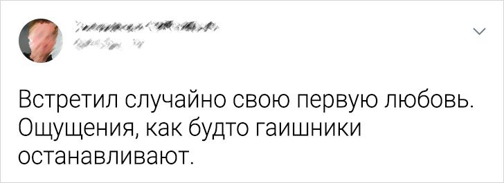 • Сейчас встретила свою бывшую любовь. Иду я такая в наушниках, перехожу дорогу к супермаркету, тут резко вылетает машина и чуть не сбивает меня. Я поворачиваю голову и вижу его за рулем. И мы смотрели друг на друга, как дебилы, где-то минуту и улыбались. Я потом все-таки ушла с проезжей части, и он поехал в другую сторону. © vkrschn / Twitter