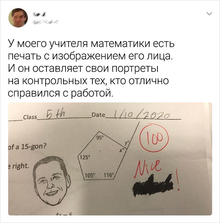 Мистер Кирк был самым безумным учителем в нашей школе. Однажды я вошел в класс и увидел, как он наклеивает искусственные перья на свою руку. Я спросил, зачем он это делает, и он ответил: «У меня птичий грипп». © Ranwithbears / Reddit- Единственный предмет, который мне плохо давался в школе, — это химия. Но зато в ней хорошо шарил одноклассник (назовем его Пашей), с которым мы сидели за одной партой, поэтому все контрольные я списывал у него. Правда, у нас были разные варианты, но я всегда ставил его вариант, думая, что учитель не заметит. Кроме того, у Паши был просто ужасный почерк — все буквы были одной волной. Но со временем я каким-то образом научился читать его шифр. И по всем контрольным получал пятерки, что меня и удивляло, и радовало одновременно. После последнего звонка в 11-м классе я подошел к преподавателю и спросил, неужели он ни разу за 2 года не увидел, что у нас с Пашей один и тот же вариант. Ответ преподавателя помню почти дословно до сих пор: «Во-первых, у тебя были хорошие оценки по всем предметам, и я не хотел портить тебе аттестат. Во-вторых, если ты смог понять, что написано у Паши, значит, ты знаешь и понимаешь намного больше, чем думаешь. В-третьих, благодаря тебе мне не приходилось тратить по часу на дешифровку контрольной Паши. Так что считай, что эти 2 года мы просто помогали друг другу». © natsval / Pikabu
