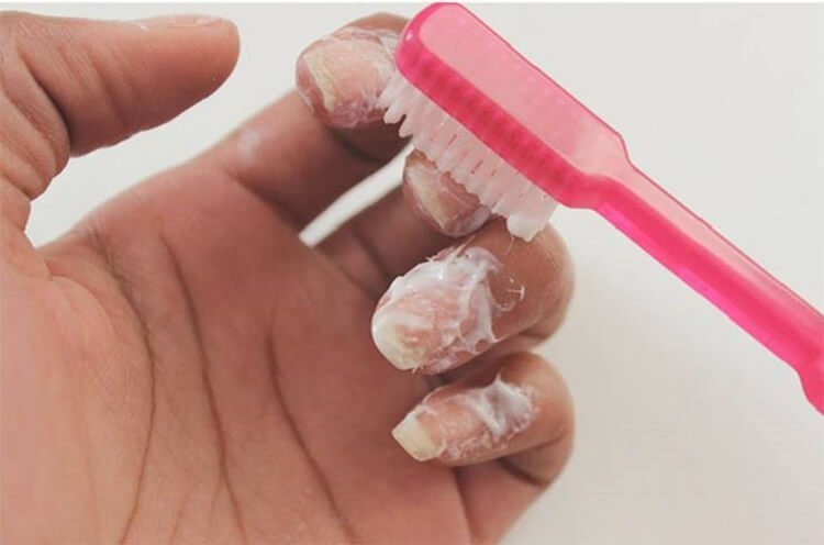 Мелкие частички лака, оставшиеся после его удаления на ногтевой пластине, и мутная поверхность ногтей смотрятся неопрятно. Протрите ногти пастой, используя щеточку.
