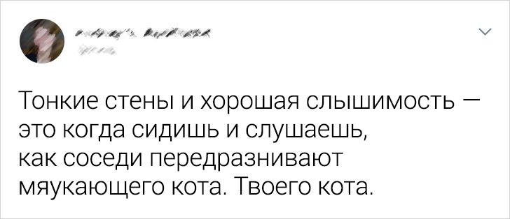 - Помню, однажды сосед поинтересовался, зачем я запираю дверь, когда нахожусь дома. Я спросила, откуда он это знает. С невозмутимым лицом он пояснил, что несколько вечеров подряд пытался ее открыть, чтобы зайти поздороваться. © ngeli ya geng geng / twitter