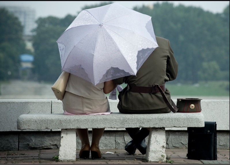 Эта фотография весьма и весьма нетипична для Северной Кореи, ведь публичное выражение чувств здесь — впрочем, как и в большинстве стран Азии, — считается чем-то очень неприличным. К тому же эта обычная на взгляд европейца фотография относится к разряду запрещенных, ведь снимать военных, особенно отдыхающих, местные власти не разрешают.