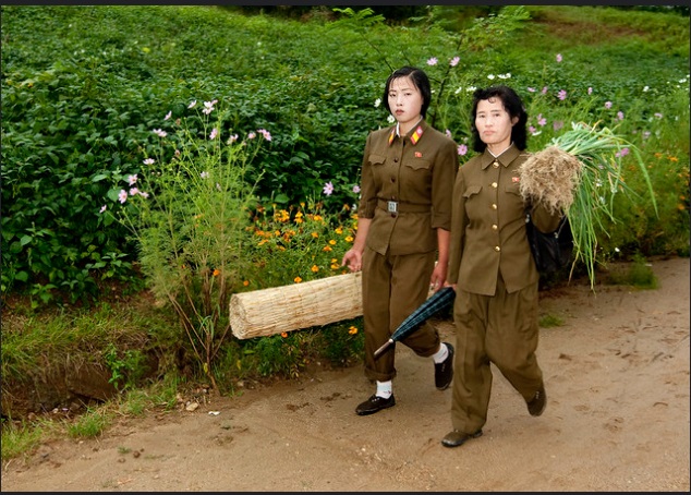 Еще одна «табуированная» фотография военных — на сей раз женщин. В 2015 году в связи с недостатком мужчин призывного возраста женщин тоже стали призывать в армию. В 17 лет все северокорейские девушки должны прибыть на призывной пункт, чтобы отправиться в армию на долгих 7 лет. Условия службы для женщин и мужчин одинаковы, причем одинаково тяжелы: военнослужащие живут в холодных бараках и так же, как и большая часть населения страны, нередко страдают от недоедания, а женщины — еще и от недостатка элементарных средств гигиены.