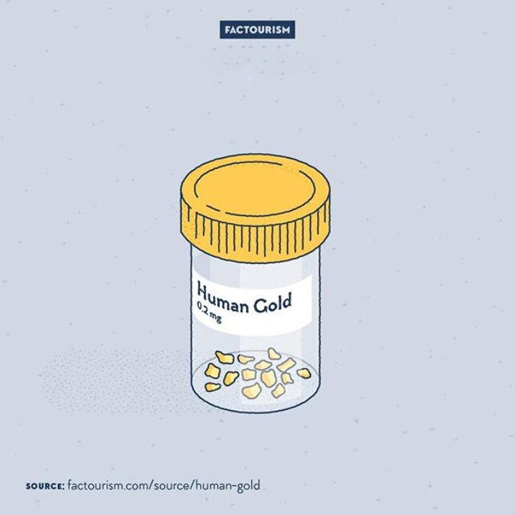 Человек весом 70 кг содержит в себе 0,2 мг золота. Объем золота в очищенном виде будет равен 10 нанолитрам. Если сформировать из него куб, то каждая его сторона равнялась бы 0,22 мм.