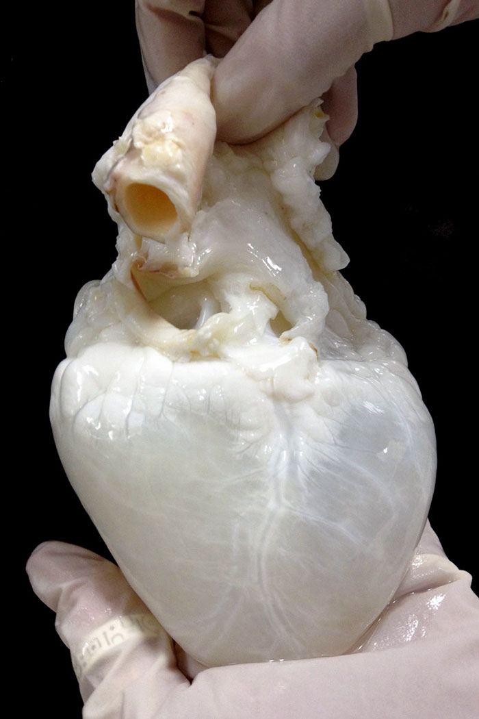 1) Сердце без крови. Пролежав в фомалине или в хлорке оно может обесцветиться.