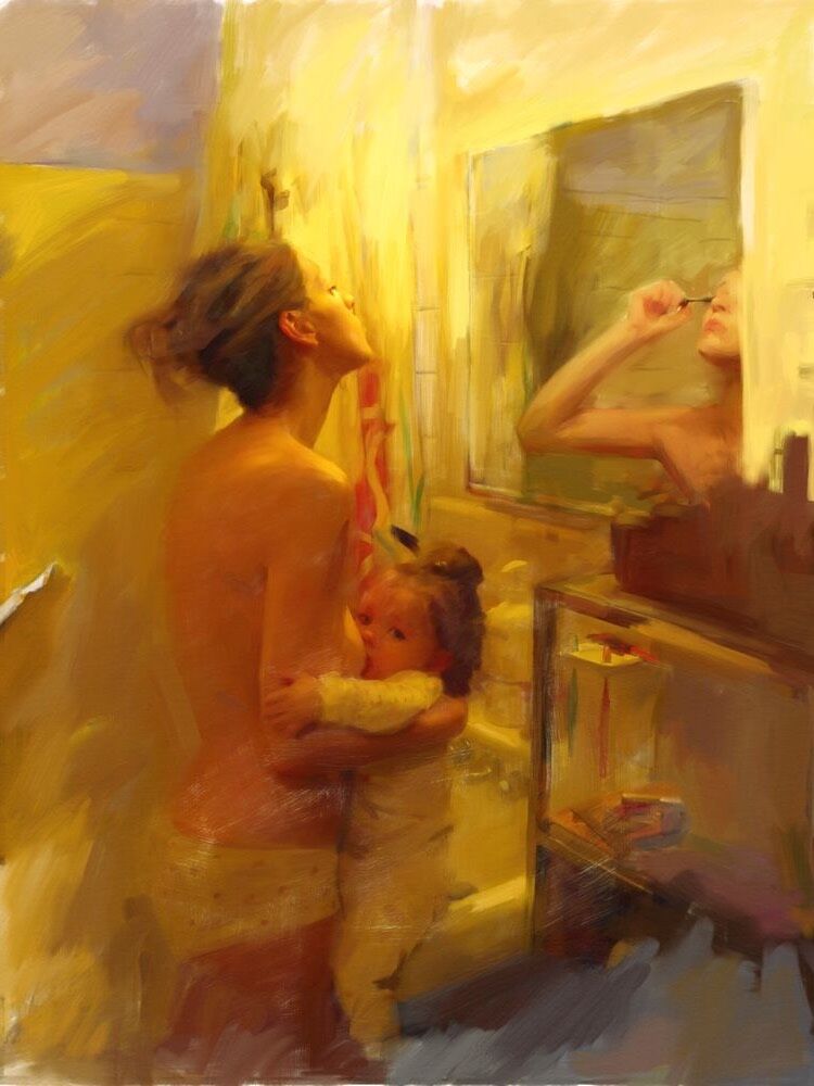 М: — Она готовит ужин, кормит нас с детьми, моет посуду, опять убирает на кухне, следит, чтобы собаку выгуляли. Помогает детям с домашними заданиями, а потом готовит ко сну — дает теплое молоко, следит, чтобы они надели пижаму и почистили зубы. Потом она в течение ночи встает покормить грудью младшенького и, если нужно, поменять ему подгузники. Ей же не нужно вставать утром на работу.