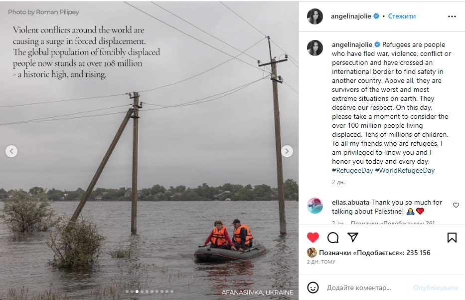 «Беженцы — это люди, которые бежали от войны, насилия, конфликтов или преследований и пересекли международную границу в поисках безопасности в другой стране. Прежде всего, они пережили самые ужасные и экстремальные ситуации на земле. Они заслуживают нашего уважения. В этот день, пожалуйста, найдите минутку, чтобы подумать о более чем 100 миллионах перемещенных лиц. Десятки миллионов детей. Всем моим друзьям-беженцам. Я имею честь знать вас и чту вас сегодня и каждый день», — подписала она свой пост.
