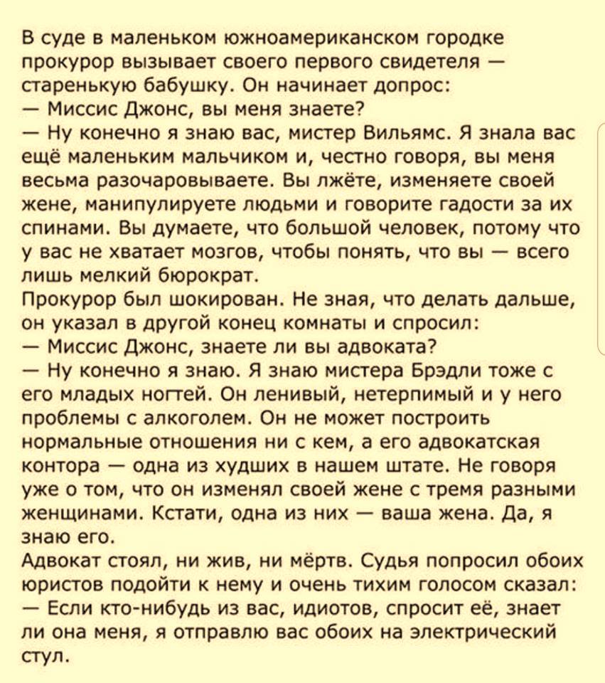 Люди, прожившую долгую жизнь в одном городе, знают очень много о его жителях, даже того, что те хотели бы скрыть от общественности. Сегодняшний «Анекдот Дня» — о наблюдательной бабушке, которую вызвали в суд.