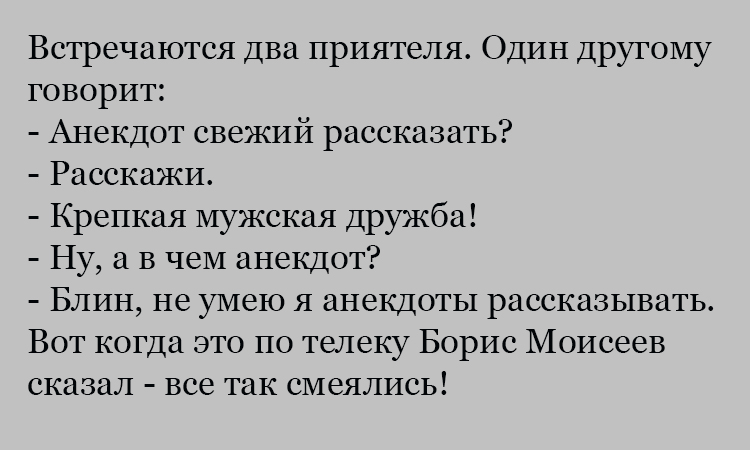 Далеко не у каждого человека есть талант рассмешить окружающих, кого-то спародировать, уместно пошутить или даже просто рассказать анекдот. Но помимо юмористического таланта зачастую важна личность того человека, который берется смешить других. О специфике рассказывания анекдотов — наш первый анекдот сегодня.