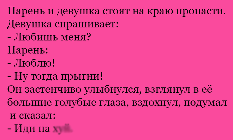 В сказках, легендах, книгах и фильмах любовь — абсолютно безграничная, всепобеждающая и героически-жертвенная. В реальности же, если обычная женщина попросит мужчину доказать свою любовь, пожертвовав жизнью, это будут выглядеть как минимум странно и не совсем адекватно. Но героиня нашего первого анекдота все решила проверить безгранична ли любовь ее мужчины, и получила очень неожиданный результат.