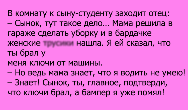 Когда сыновья подрастают, и становятся молодыми мужчинами, они стают своим отцам настоящими друзьями, с которыми можно и машины пообсуждать, и симпатичных девушек, и рюмочку вместе выпить… Вот и герой нашего первого анекдота решил, что их отношения достаточно близки, чтоб взрослый сын помог ему оправдаться перед матерью, ведь та нашла кое-то очень неожиданное и компрометирующее, и даже не пожалел свою «ласточку» для правдоподобности…