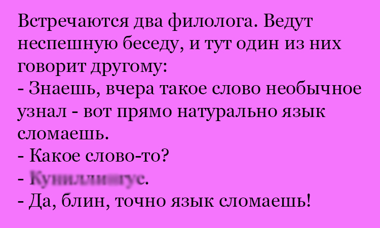 В зависимости от поколений, культур, национальностей, возраста и множества других факторов — у всех нас довольно разный словарный запас. А вот когда встречаются два филолога, и начинают обсуждать не совсем понятное им слово — становится весело! И именно это произошло с героями нашего первого анекдота.