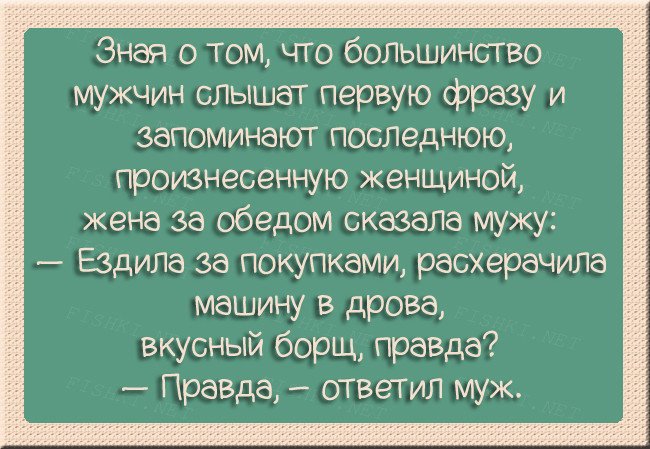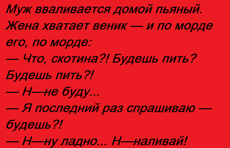 Жены зачастую очень не любят, когда их мужья приходят домой в явно нетрезвом состоянии, и пьяненький мужья зачастую обещают, что это было в последний раз. Вот и герой нашего первого анекдота явился в дом под градусом, и не задумываясь согласился с тем, что пить больше не будет, но не то, чтоб слишком уж долго держал свое слово…