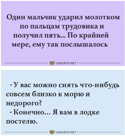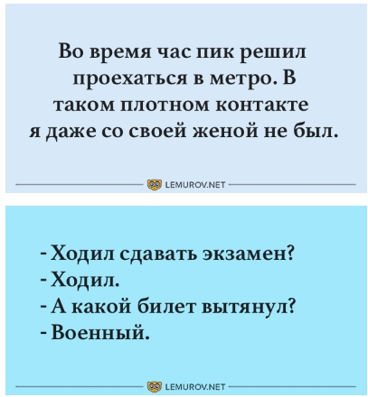 Какой же выходной без шуток, юмора и анекдотов. Ведь это неотъемлемая составляющая любого удачного досуга. Вот поэтому мы и насобирали для вас эти 10 замечательных шуток из разных уголков бескрайних просторов сети. Пусть они внесут свою лепту в ваше настроение.