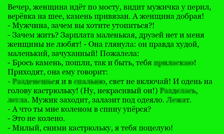 Порой добрые дела действительно вознаграждаются, и решив сделать что-то хорошее в ответ можно получить приятный неожиданный сюрприз. И именно это случилось с героиней нашего анекдота — она решила спасти и приласкать некрасивого, тощего мужичка, решившего свести счеты с жизнью, но ее ждало неожиданное открытие… Какое именно — читайте сами!