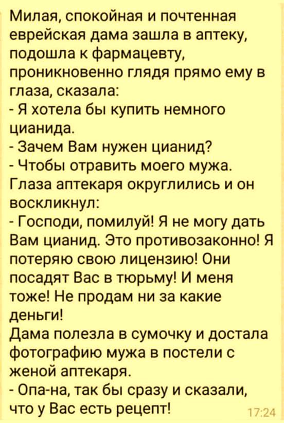 К одним и тем же вещам мы можем кардинально поменять отношение, узнав о том, что это не абстрактная ситуация незнакомого нам человека, а непосредственно касающаяся нас реальность. О том, как милая женщина убедительно аргументировала фармацефту свое желание отомстить мужу, и как быстро он вошел в положение дамы, узнав самый главный убедительный аргумент — сегодняшний Анекдот Дня.