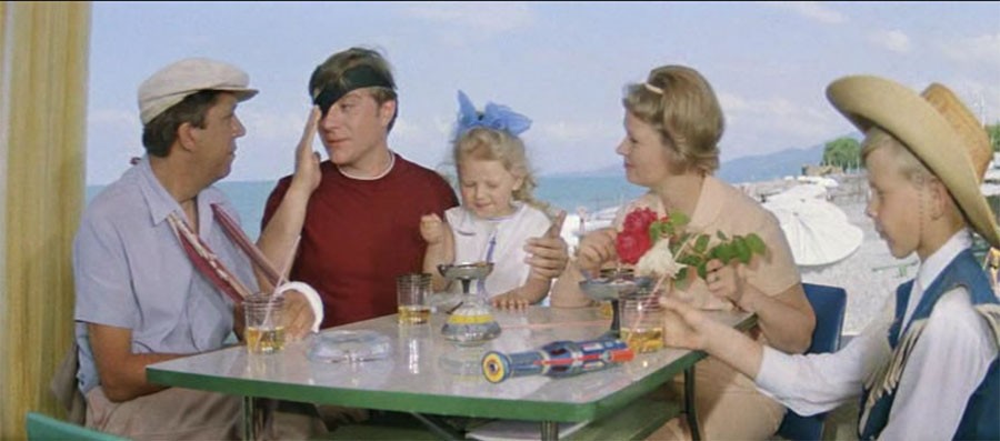 Тоже всё объяснимо. Чтобы не терять динамику фильма, режиссёр показал нам не всё. Помните, что сказал Лёлик про Козодоева в этой сцене? «Идиот!» Геша действительно купил два мороженных и два цветка. Но он всё же не полный идиот. Когда он вручил супруге приятеля два цветка, то понял свой косяк и быстренько сбегал до ближайшего цветочного (или клумбы) за ещё одним цветком. А мороженое… Ну так их разговор тоже не весь вошёл в фильм, фактически только приглашение на рыбалку и показал Гайдай. А сидеть в кафе и болтать они могли долго. Эскимо, возможно было быстро съедено детьми и добрый дядя Геша заказал им ещё по мороженке уже в самом кафе. Так что тоже никакого ляпа тут нет.