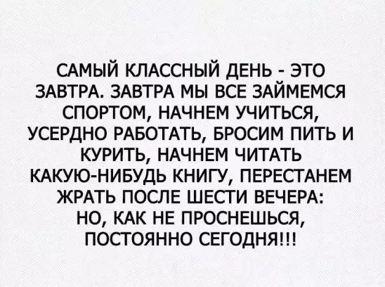 Накануне середины недели нужно хорошенько подготовить своё настроение к ударному темпу работы. Ведь чем продуктивнее труд – тем потом ярче отдых. Но делать это нужно по-умному: без фанатизма и занудства. Предлагаем в качестве основного метода подготовки использовать наши анекдоты – здесь вы найдёте настоящее руководство к действию: как вести себя в той или иной ситуации, что остроумного сказать, как проще смотреть на вещи… Впрочем, даже если прикладных материалов вы здесь не найдёте, всё равно время даром не пройдёт. Ведь взамен на прочтение вы получите самое ценное – хорошее настроение на весь грядущий день. Чего мы искренне всем желаем!