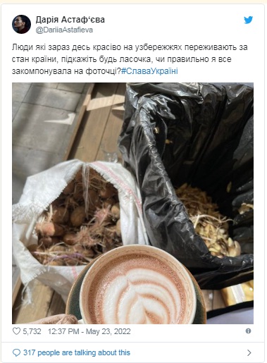 На днях артистка опубликовала свежее фото с волонтёрского штаба, где она как раз чистила картошку. Дарья решила немного поиронизировать, выставив новый пост в своём Твиттер-аккаунте. На снимке Астафьева держит чашку капучино в резиновых перчатках на фоне картофеля: