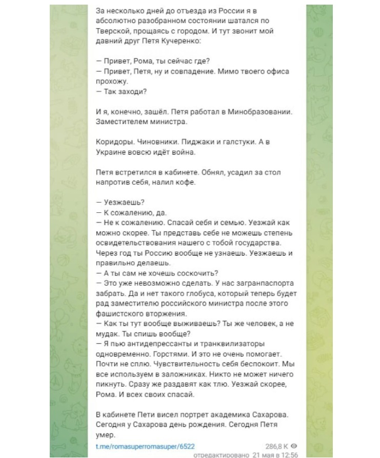 «Я пью антидепрессанты и транквилизаторы одновременно. Пригоршнями. И это не слишком помогает. Почти не сплю. Чувствую себя ужасно. Мы все – заложники. Никто ничего не может пикнуть. Сразу же раздавят как тлю. Езжай скорее, Рома. И всех своих спасай», – процитировал друга журналист.