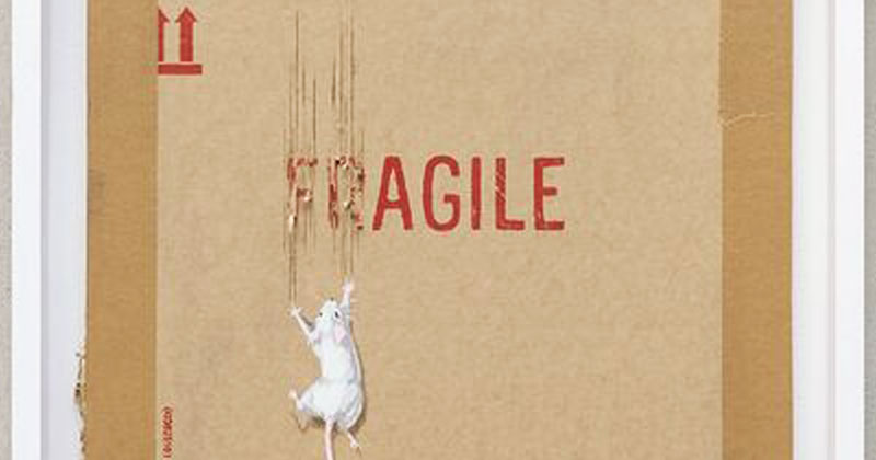 Герой благотворительной картины Бэнкси — мышь, которая вцепилась когтями в картонную коробку с надписью «fragile» («хрупкий»), превращая ее в слово «agile» («ловкий»).