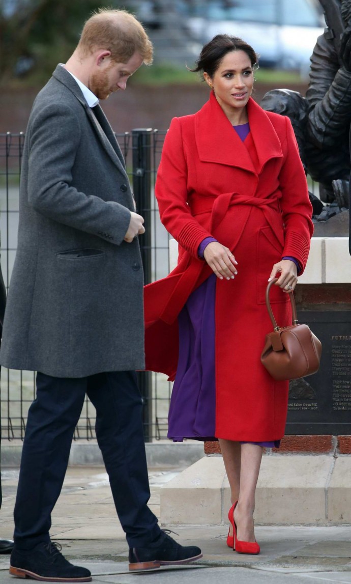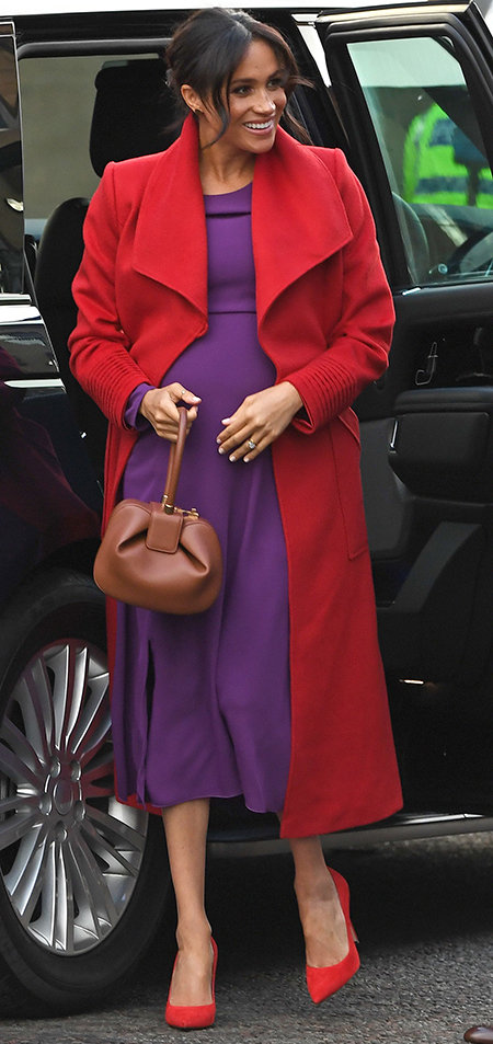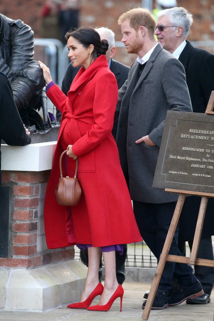 Жена принца Гарри находится на заключительных месяцах беременности, но отдает предпочтение смелым нарядам и туфелькам на огромной шпильке! Для этой акции Меган Маркл выбрала одежду непривычно ярких оттенков. Как правило, герцогиня появляется на людях почти исключительно в платьях черных, темно-зеленых или темно-синих спокойных тонов. Однако в Беркенхеде она поразила всех сиреневым платьем Babaton, ярко-красным пальто Sentaler и туфлями-лодочками в тон пальто. Надо отметить, что Меган Маркл по-прежнему предпочитает элегантные туфельки на огромных 16-сантиметровых шпильках. Хотя ей давно уже следовало сменить модную обувь на более удобные варианты для беременных.