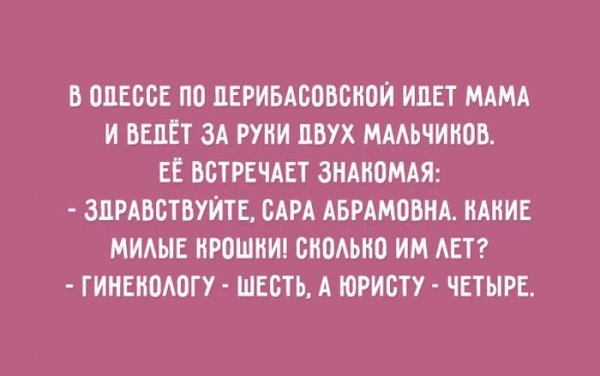 Что-то давненько у нас не было подборки всеми любимого одесского юмора. Надо это срочно испрвлять! Чтобы наверстать упущенное, мы собрали для вас большую коллекцию самых смешных и жизненных шуток одесского народа на самые различные темы. Тридцать лучших анекдотов уже готовы и ждут вашего прочтения.