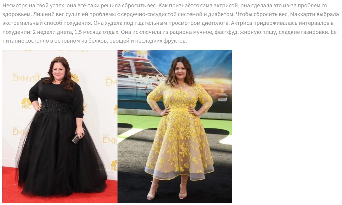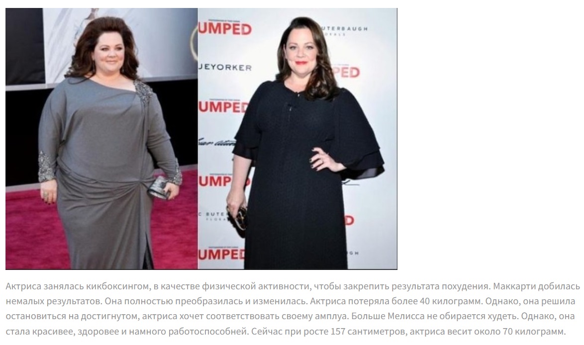 Мелисса Маккарти — успешная и известная актриса, которую знают зрители со всего мира. Не смотря на свои далеко не голливудские стандарты, ей не просто удалось добиться популярности, но и превратить свой избыточный вес в настоящую визитную карточку. Так, нестандартная внешность помогла ей создать образ комедийной актрисы. Что, в свою очередь, привело Маккарти к номинации в премии «Оскар», а также в список «Форбс» как самую высокооплачиваемую звезду Голливуда.