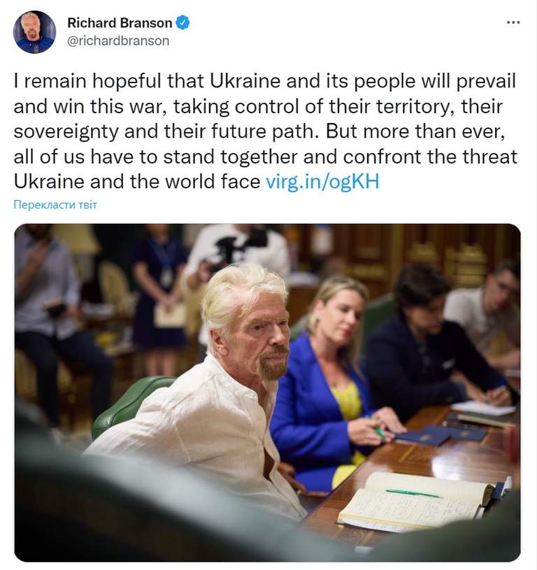 Отметим, что Ричард Брэнсон с первых дней войны активно выступает в поддержку Украины, ее суверенитета, территориальной целостности, а также за самые жесткие санкции против рф, ее лидеров и экономики.