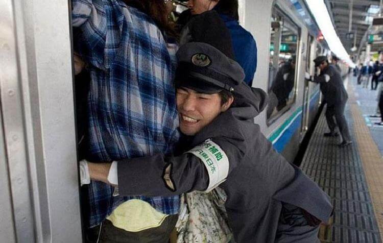 Час пик в Японии выглядит как абсолютный кошмар. Специальные работники буквально заталкивают пассажиров в переполненные вагоны. Во время таких поездок трудно не вторгаться в личное пространство стоящего на одной ноге рядом.