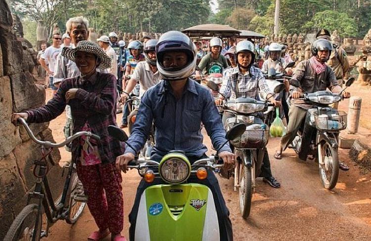 Большинство жителей Камбоджи передвигаются на мопедах. Положительный момент этого транспорта заключается в том, что его много помещается на дороге. А его недостаток в том, что в толчее легко свалиться вместе с мопедом на встречную полосу.