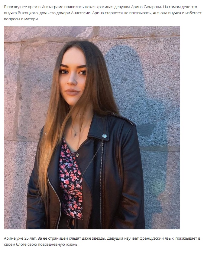 Владимир Высоцкий вошел в историю музыки как авторитетный автор песен с хриплым голосом. Однако в личной жизни ему повезло не настолько, как в карьере. Так, певец два раза был женат, и в итоге пережил два развода. Впрочем, браки всё же принесли свои плоды в виде ребенка и уже даже внучки. Недавно взрослая внучка Высоцкого была замечена и идентифицирована в соцсетях. Сейчас покажем, как она выглядит. А вы посмотрите и поделитесь своим мнением в комментариях — похожа ли девушка на своего звездного дедушку?