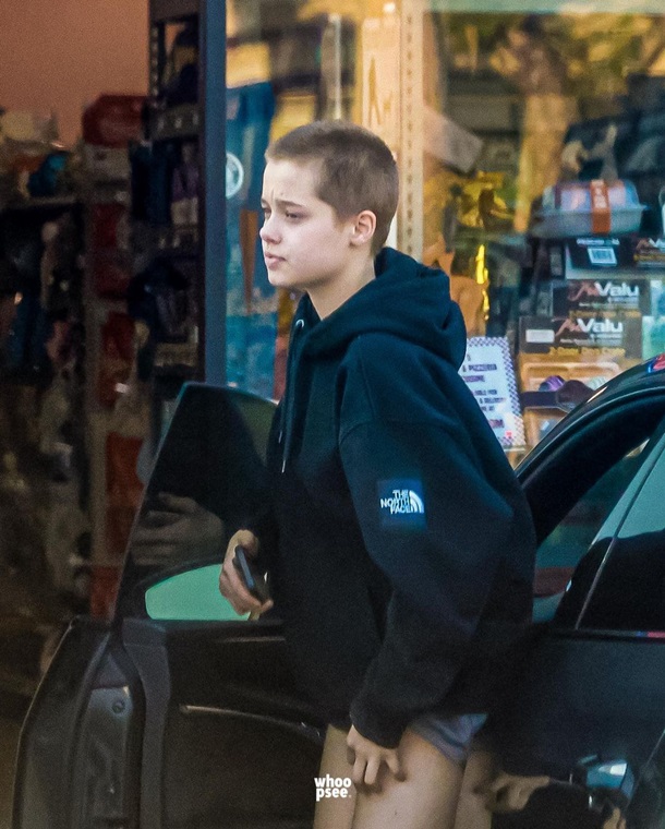 Так, девушка как раз выходила из магазина в авто, когда фотографы запечатлели эти кадры. На них видно, что школьница обрила голову. Шайло была одета в короткие шорты и оверсайз худи.