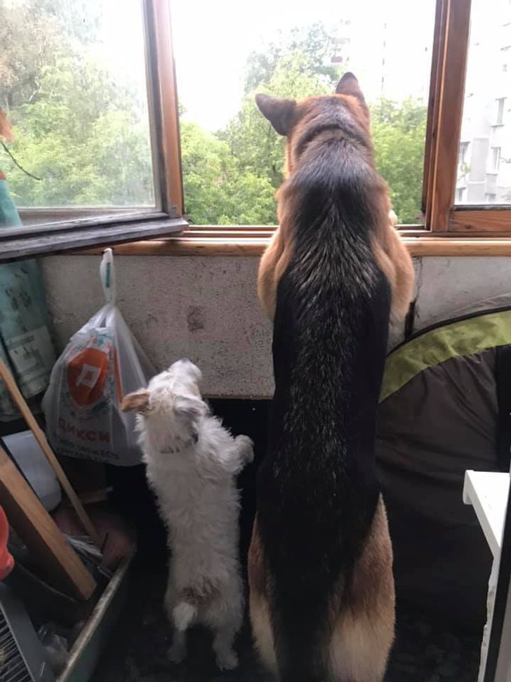 • Мои собаки как-то узнают звук автомобиля мужа и сразу летят на балкон. Это всегда выглядит так.