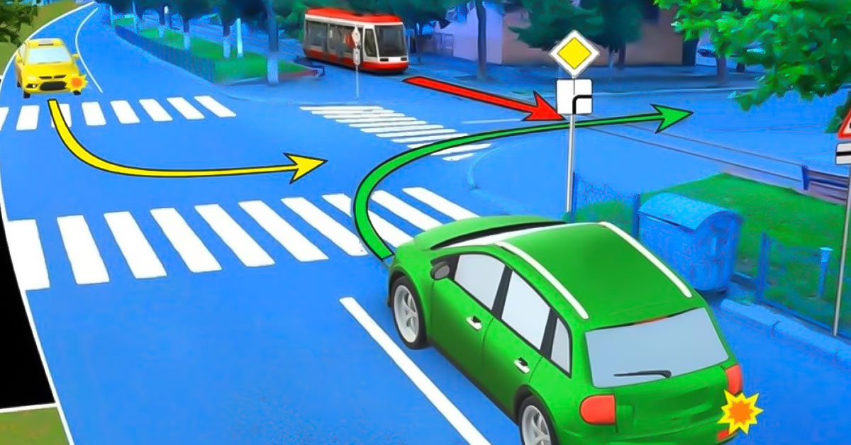 В итоге, чтобы понять, какой порядок разъезда между зеленым и желтым автомобилем, нам вполне хватит именно этих двух знаков. Конечно, как ты наверняка можешь отметить, перед желтым транспортным средством расположился знак 2.1 «Уступить дорогу». И, что интересно, не пропускать зеленое авто водитель желтой машины мог бы лишь в одном случае.