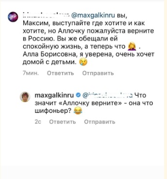 «Вы, Максим, выступайте где хотите и как хотите, но Аллочку, пожалуйста, верните в Россию. Вы же обещали ей спокойную жизнь, а теперь – что? Алла Борисовна, я уверена, очень хочет домой с детьми», – написала подписчица.