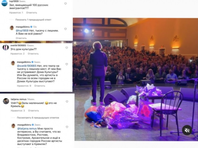 «Это дом культуры?», «Зал, вмещающий 100 русских эмигрантов??» — ехидно поинтересовались российские подписчики Галкина, намекая на небольшое количество зрителей в зале.