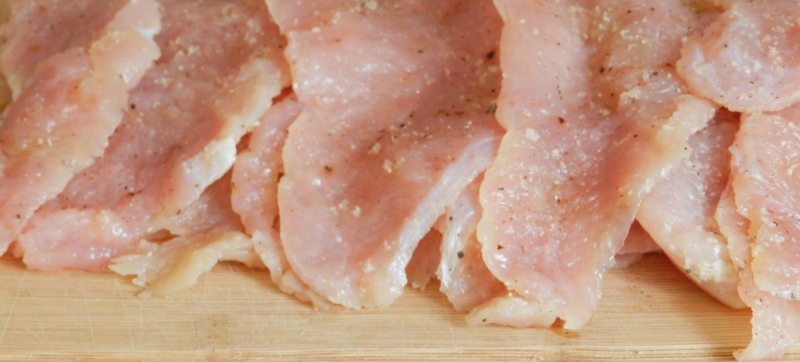 - Филе вымойте, нарежьте поперек волокон широкими пластинами. Под пленкой отбейте каждую с обеих сторон, смажьте оливковым маслом, посолите и поперчите по вкусу.